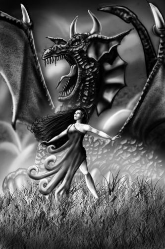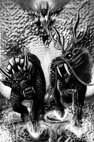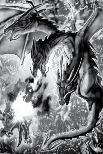 Shown is the 3-headed dragon Gorynych, ridden by the Avatar Gobrynya, during an attack on a hundred-headed Ladon.